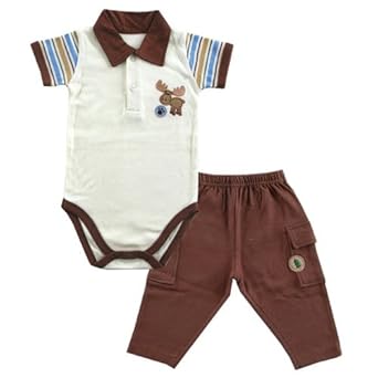 Premium brand Hudson Baby infant clothes are an attractive and stylish way to dress your precious little one. Made of the highest quality 100% combed cotton these garments are soft to the touch on your baby's skin. This set of bodysuit and matching pants comes in an adorable moose themed design under the Moose Crossing Collection. Polo style bodysuit has collar, snaps and appliqued moose and patch, and pants have cargo pockets and patch for a stylish look. Available in sizes up to 12 months.